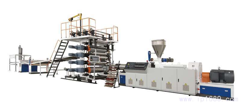 該生產(chǎn)線由供料系統(tǒng)、800/2500高低混合機組、破碎機、磨粉機、擠出復(fù)合成型機等組成,具有用場地小、自動化程度高、操作簡便、生產(chǎn)效率高、更換產(chǎn)品快、生產(chǎn)運行穩(wěn)定可靠、生產(chǎn)成本低、成品率高等優(yōu)點。其總裝機量約為200KW,可生產(chǎn)寬1300mm,厚度1.5-8mm的復(fù)合地板,在SPC復(fù)合地板的生產(chǎn)中,該設(shè)備首先由擠出機EXTRUDER擠出PVC基材,再用四輥壓延機組分別把PVC彩膜+PVC耐磨層+PVC底膜,一次性壓貼復(fù)合生成的產(chǎn)品,工藝簡單、貼合靠熱量完成,不含膠水。SPC地板材料使用環(huán)保配方,由UV層、透明耐磨層、印刷裝飾層和PVC硬質(zhì)層構(gòu)成,不含重金屬、鄰苯二甲酸酯、甲醛等有害物質(zhì),具有綠色環(huán)保、輕盈耐磨、防潮防燃等眾多優(yōu)點,符合EN 14372、EN 649-2011、IEC 62321、GB 4085-83標(biāo)準(zhǔn)。