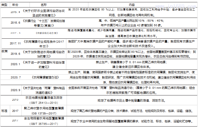 表 1 中國關(guān)于農(nóng)膜的相關(guān)政策及標(biāo)準(zhǔn)