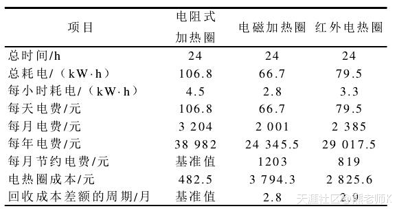 上述數(shù)據(jù)表明,雖然電磁加熱圈與紅外加熱圈較電阻式加熱圈初期的投資成本很高,回收投資成本差額的周期約3個月左右,但節(jié)能的經(jīng)濟效益還是比較可觀的。