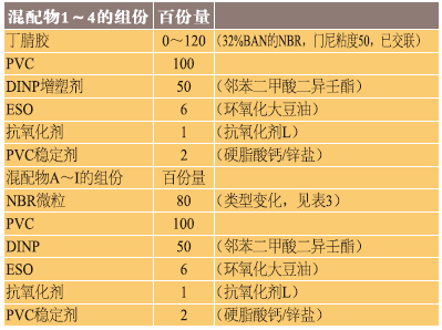 丁腈橡膠可與其它彈性體和熱塑性塑料混合。與NBR混合的主要熱塑性塑料就是PVC。這兩種聚合物在熔化時形成易混合體系,NBR加到PVC后可顯示出耐臭氧性能,這在單獨的PVC中是不可能的??梢奝VC在添加丁腈聚合物后性能得以提升。其關(guān)系表明在表1中。