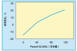 混配物1~4分別是于PVC樹脂中漸漸增加32%BAN 50門尼粘度的交聯(lián)NBR到最大120份量。總體來說,從較低NBR量直至NBR量高達120份量的混配物4,可觀察到壓縮永久形變性能和在IRM903油中老化的體積變化均得以連續(xù)改善。