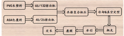 3.ASA-PVC共擠:指ASA包覆料和 PVC干混料,經獨立的流道在離開口模前匯合,ASA熔體以極薄的厚度與 PVC熔體大面積復合,并一起被擠出模外,再經定型模及水箱冷卻定型;經拋光、牽引后貼保護膜,最后鋸切成規(guī)定長度。