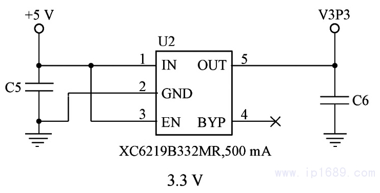 3.9V 電源模塊(如圖7所示)采用 MIC293O2電源轉(zhuǎn)換芯片外加電容電阻組成 3.9V 穩(wěn)壓電路,1腳是使能端,高電平有效; 2腳+5V 輸入;4 腳輸出穩(wěn)定的3.9V 電壓,為 GPRS芯片 MG2639提供電源.3.3V電源供電模塊(如圖8所示)采用電源轉(zhuǎn)換芯片XC6219B332MR,電容C5用于輸入端濾波,電容C6 用于輸出端濾波,為 STM32 主控制器、485接口電路和數(shù)字量輸入輸出電路提供電源。