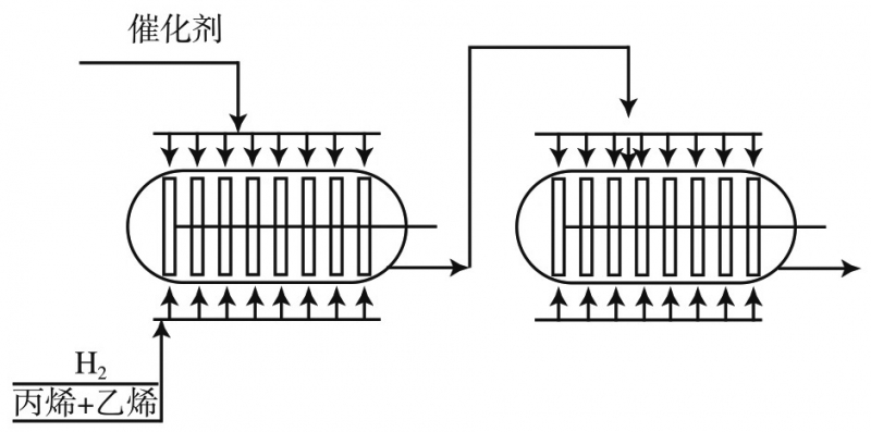 國(guó)內(nèi)使用英力士Innoven工藝的裝置共13套, 較為典型的生產(chǎn)企業(yè)為燕山石化、獨(dú)山子石化及茂名石化。Innoven氣相法采用接近活塞流式的臥式反應(yīng)器,并帶有一個(gè)特殊設(shè)計(jì)的水平攪拌器, 反應(yīng)器上眾多的氣液進(jìn)口用于催化劑、急冷液,以及氣相丙烯、乙烯、H2的注入,可控制每個(gè)區(qū)域氣相的加入量,因此,可實(shí)現(xiàn)MFR及Mw/Mn的精確控制。采用該工藝生產(chǎn)的PPR(牌號(hào)分別為4400和T4401)已通過(guò)國(guó)家化學(xué)建材測(cè)試中心PPR100等級(jí)認(rèn)證[3]。該工藝反應(yīng)器組合方式見圖3。