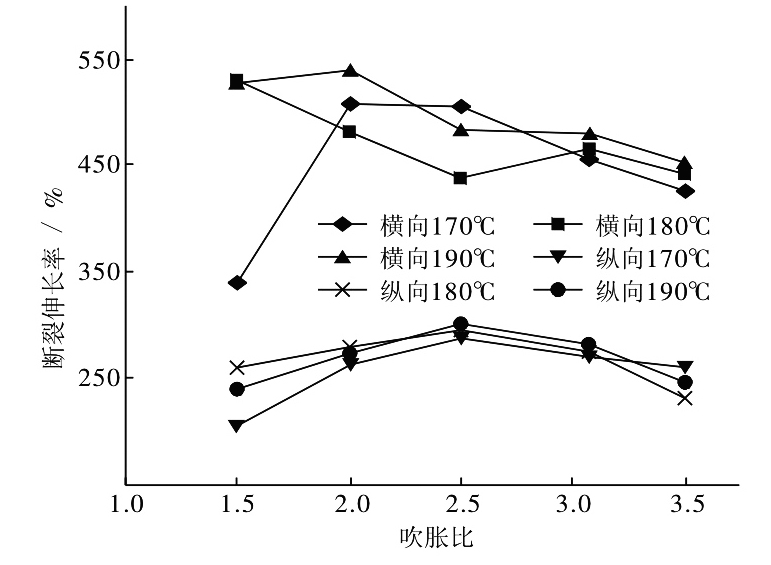 (2)對(duì)薄膜拉伸斷裂應(yīng)變(斷裂伸長(zhǎng)率)的影響。由圖4可知,加工溫度的變化對(duì)拉伸斷裂應(yīng)變(斷裂伸長(zhǎng)率)的影響并不明顯;隨著吹脹比的增加,膜的橫向斷裂應(yīng)變逐漸下降,而縱向斷裂應(yīng)變隨吹脹比增加逐漸上升,隨后趨于平穩(wěn);吹脹比為3.0時(shí),橫向與縱向拉伸斷裂應(yīng)變基本達(dá)到平衡[6]。