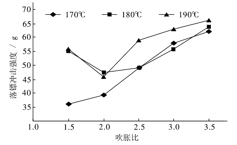 圖5加工溫度和吹脹比與沖擊強(qiáng)度的關(guān)系圖