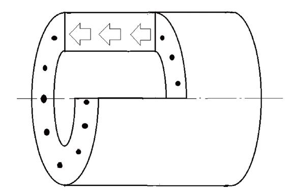 為改變這一落后技術(shù),曼瑞德自控系統(tǒng)公司申請了PCT專利,并獲美國授權(quán),如圖2所示。采用這項專利技術(shù),使塑料管材在擠出成型過程中,熔體流動方向由平行于管材軸線轉(zhuǎn)變?yōu)榇怪庇诠懿妮S線方向,塑料大分子鏈取向也由平行于管材軸線轉(zhuǎn)變?yōu)榕c管材軸線垂直,并與管材園周相切,管壁強度垂直于管材軸線方向大于平行于管材軸線,纖維增強的熱塑性塑料管材亦將實現(xiàn)真正意義上的垂直于管材軸線方向上的增強。這個專利提供了一種改變?nèi)垠w流動方向的關(guān)鍵技術(shù),即含有導(dǎo)流板的擠出涂覆機頭及含有涂覆機頭的塑料管材涂覆成型裝置。塑料管材擠出涂覆成型機頭如圖3所示。