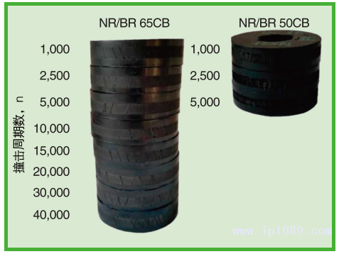 圖7、使用文中描述的條件,NR/BR 65CB和 NR/BR 50CB化合物撞擊周期數(shù)對P的影響