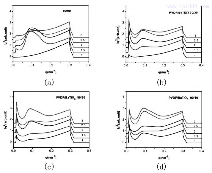 為了研究擠出流延成膜中 BaTiO3的加入量以及不同拉伸比對 PVDF 晶體結構的影響,本方法用廣角 X 射線衍射(WAXD)對 PVDF/BaTiO3 復合膜的晶體結構進行了分析。圖 1 給出了拉伸比不同的PVDF/BaTiO3 復合膜二維WAXD 圖樣。圖中出現(xiàn)了明顯的 PVDF 衍射環(huán),從里到外分別對應于(100)、(110)和(021)晶面。未拉伸的 PVDF 膜各晶面衍射環(huán)完整,說明樣品中沒有取向。隨著拉伸比的增加,(100) 和(110)晶面的衍射環(huán)在拉伸方向上逐漸減弱,而在垂直于拉伸方向上明顯增強。這說明(100)和(110)晶面在拉伸的作用下發(fā)生了取向,且取向的程度隨著拉伸比的增加而增強。加入 BaTiO3 后,拉伸比相同時,復合膜的取向程度明顯大于純 PVDF,可見 BaTiO3 促進了 PVDF 分子鏈在應力場中的取向。由圖 2 可知,PVDF 的特征衍射峰的 q=2、2.05 和 3nm,別對應于(100)、(110)和(021)晶面,拉伸比對其晶體的結構沒什么影響,在各種拉伸比下熔融處理的 PVDF 其結晶相均為α型 PVDF。從圖(a)我們可以知道隨著拉伸比的增加,α相衍射峰的強度明顯減弱,說明隨著拉伸比的增加,PVDF 的結晶度明顯降低,可見拉伸作用會使晶片破壞。圖(b)我們可以看處在組分比為 70/30 時,α相衍射峰的強度明增強,但是拉伸比為 1 和 1.5 的時候α相衍射峰明顯減弱,而拉伸比為 2,2.5,3 的時候峰明顯增高。圖(c)中曲線變化很圖(b)十分相似,圖(d)的曲線的峰隨著拉伸比的增大峰的變化程度明顯減弱。這是因為 PVDF/BaTiO3 膜擠出流延過程中,由于 BaTiO3 分子的存在,PVDF 分子在應力場作用下的縱向伸展,阻止 PVDF 片晶的破壞。
