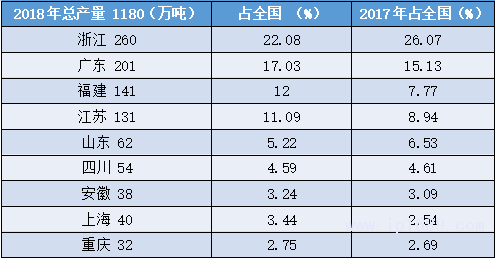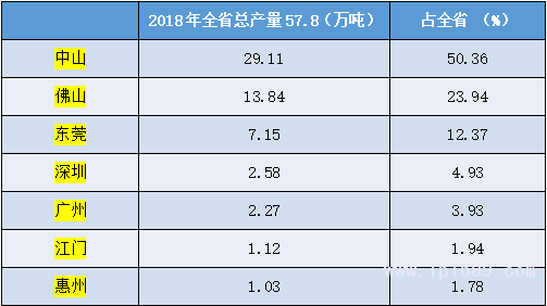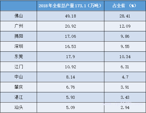 佛山、東莞、廣州等大灣區(qū)城市是主產區(qū),佛山的產量占全國約4.75%,可排在省份第7。東莞的產量占全國3.5%,可排在同期省份第11 。