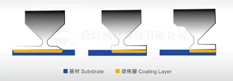 微凹輪透過滾輪上網(wǎng)紋進(jìn)行涂布,涂布厚度容易受網(wǎng)紋影響,適用于中低黏度(小于3000cp)涂布;逗號(hào)輪則是透過與基材間間隙來控制涂布厚度,接觸面容易產(chǎn)生條紋或氣泡,適合中黏度(500-5000cp),實(shí)務(wù)使用上為了因應(yīng)更多元涂布制程,建議可使用多功能涂布座,能夠針對(duì)生產(chǎn)需求選用狹縫式模具、微凹或是逗號(hào)輪。